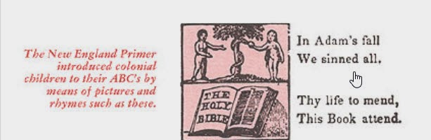But this doctrine, which seems to have fallen on hard times, it was once the popular and only one for the early British Americans known as the Puritans. The New-England Primer, one of the first books printed in America in 1687 was the first reading primer designed for the American Colonies. They used this little book to teach children the Alphabet by creating catchy rhymes to help children to remember each letter. The first letter in the alphabet is A, so they thought they should begin with a foundational truth about Adam. These early American Puritan children were taught to define the "self" by relating their life to the authority of God and His Word.